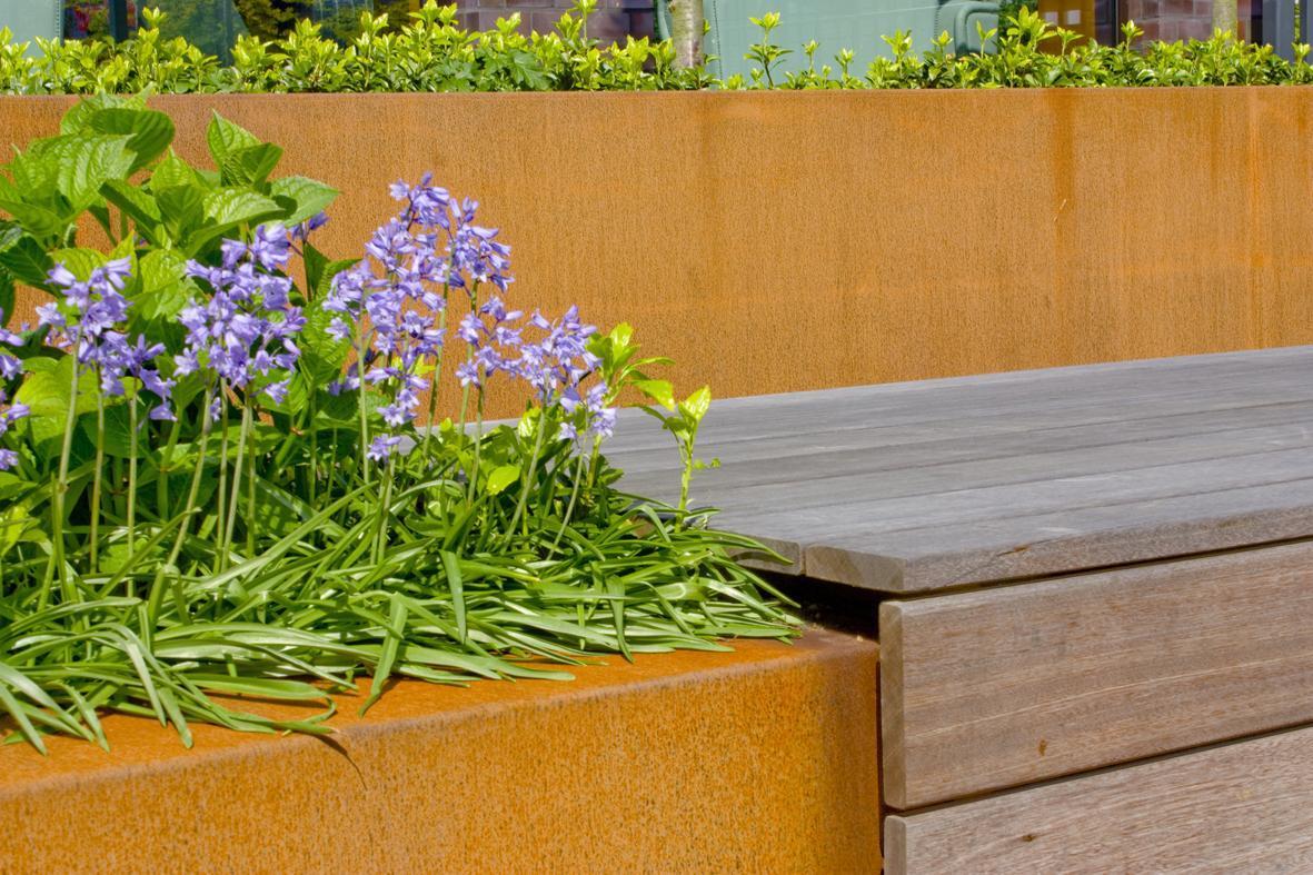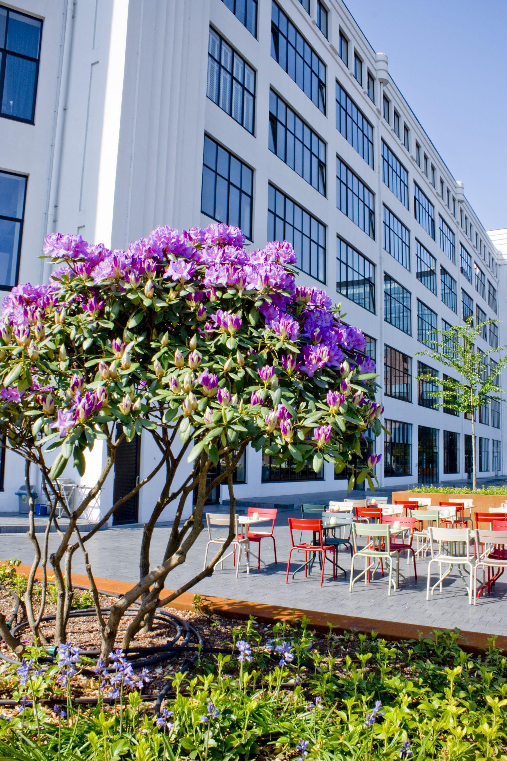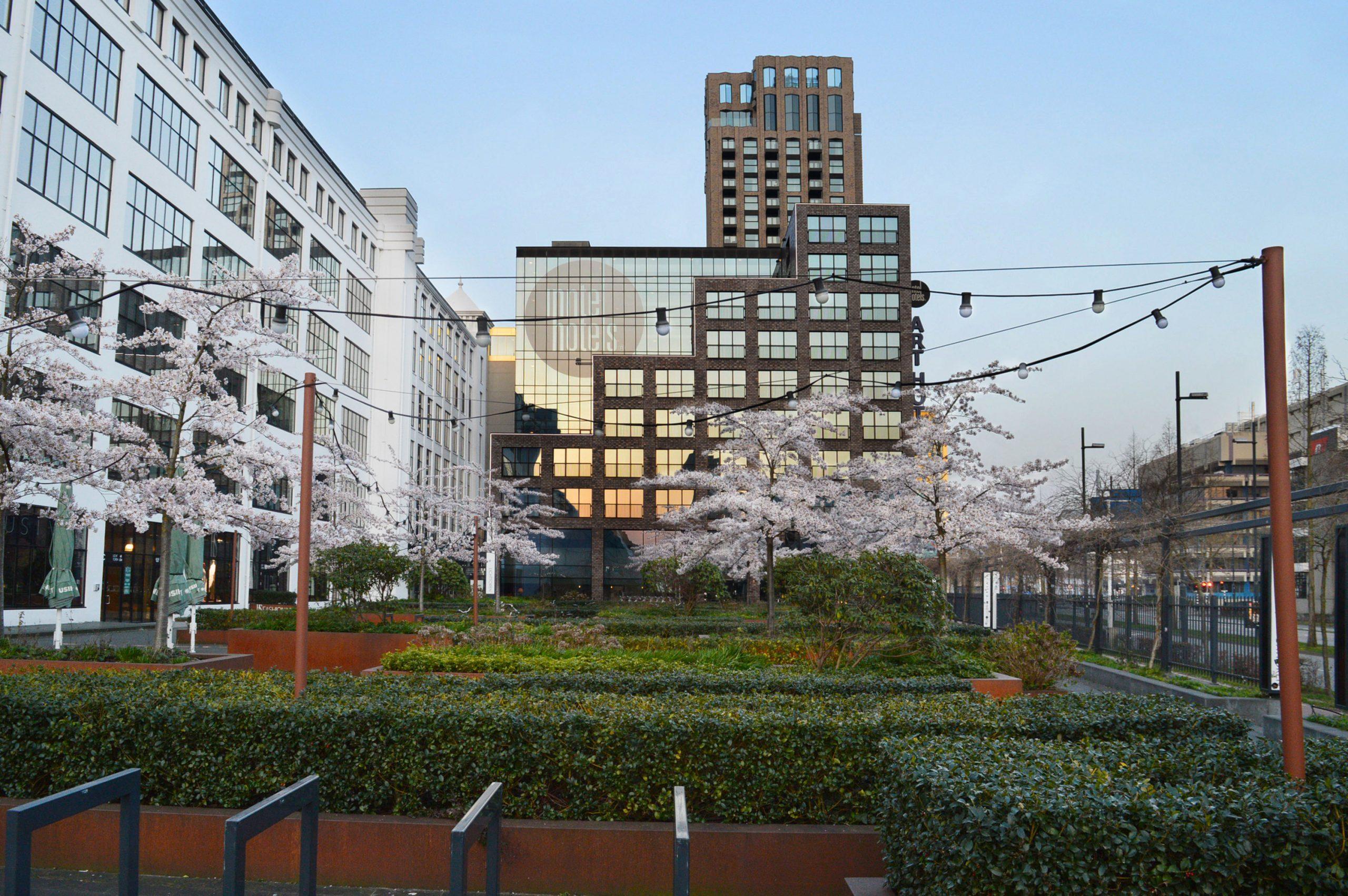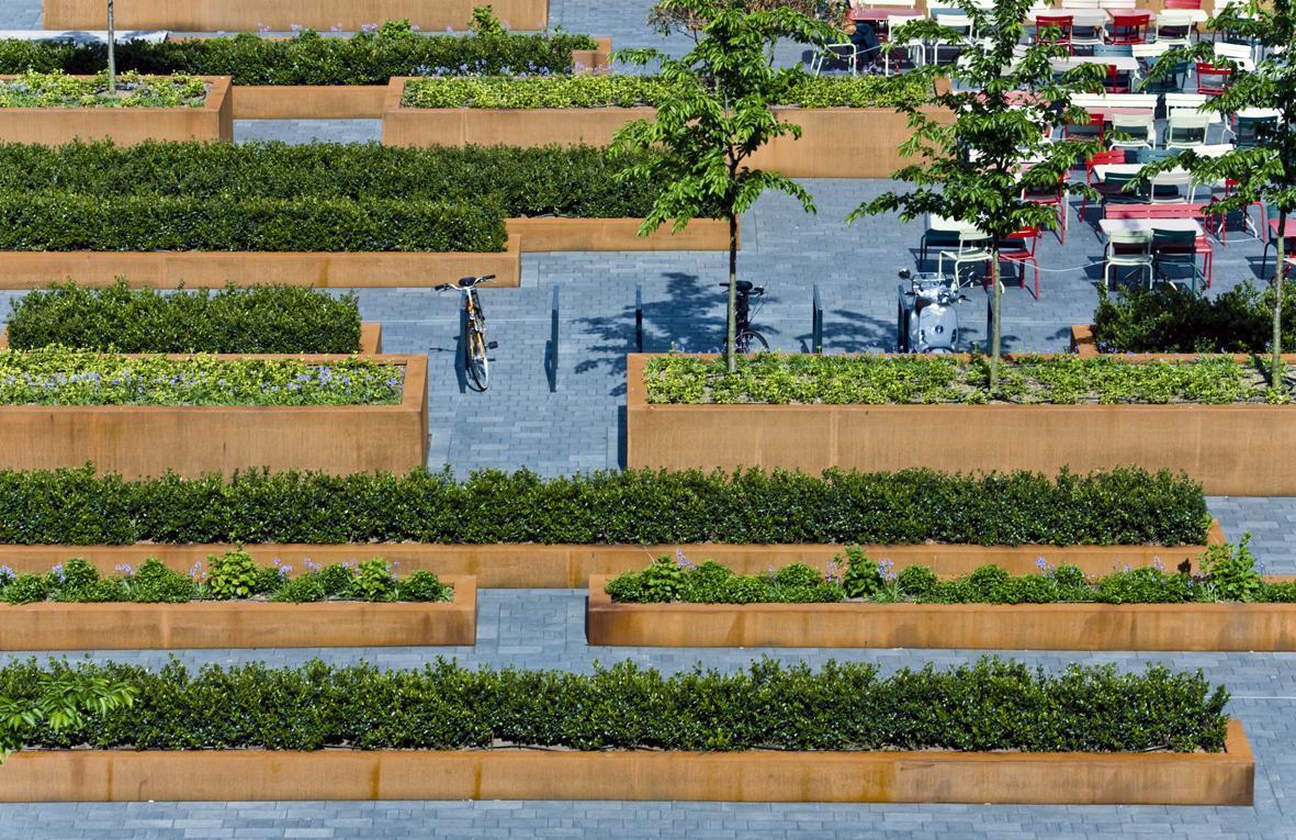 Aan de voet van één van de belangrijkste iconen van Eindhoven, de Lichttoren, is een nieuw plein verschenen. Een pergola begroeid met blauwe regen en rozen biedt de voorbijganger een blik op het semi-openbare parkje. Hier kan men na het winkelen even neerstrijken op het terras of rustig op een bankje tussen weelderige planten ontsnappen aan de verkeersdrukte van het centrum. De amorfe vorm van het gebied vroeg om een strikte structuur, die rust brengt op het plein en bovendien het zicht op de Lichttoren optimaal garandeert. Het ontwerpconcept is daarom gebaseerd op strips en lijnen die haaks staan op het gebouw en de menselijke schaal terugbrengen. De eenheid in het ontwerp wordt bewaard door een consequent vorm- en materiaalgebruik: een sobere grijze vloer, robuuste bakken van cortenstaal, warme houten banken. De hoofdrol is weggelegd voor de beplanting: wintergroen, seizoensbloeiers en accenten van rododendrons.