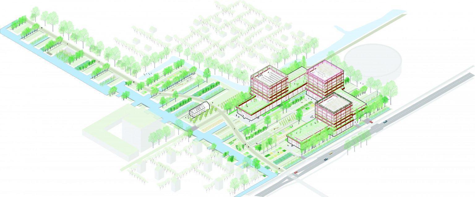 De Stadsbiotoop presenteert een nieuwe vorm van stedelijkheid. Hier gedraagt het landschap zich als stad en de stad als landschap. Zo is het landschap stedelijk intensief geprogrammeerd. Een watermachine zuivert het grijze water en zorgt voor variatie in flora en fauna. Er zijn woongebouwen en multifunctionele verzamelgebouwen. Bewoners kweken er hun eigen voedsel. Overal zijn plekken om te werken, spelen en sporten. Het landschap is opgebouwd uit rabatten die door hoogteverschillen een natuurlijke zonering creëren van openbaar, semi-publiek en privaat gebruik. Hoe dichter bij de gebouwen, hoe hoger de ligging en hoe privater het gebruik. De architectuur voegt zich naadloos in dit rabattenpark. De gebouwen hebben stedelijke volumes, programma’s en trekken een diversiteit van bewoners aan. Tegelijkertijd verbinden hun groene gevels de woningen met de natuur. Elke bewoner heeft een buitenruimte waar de gemiddelde stedeling alleen maar van kan dromen. Kortom, de symbiose van stad en land brengt ogenschijnlijk tegengestelde functies – wonen, ecologie, waterbeheer, recreatie – samen in de Stadsbiotoop