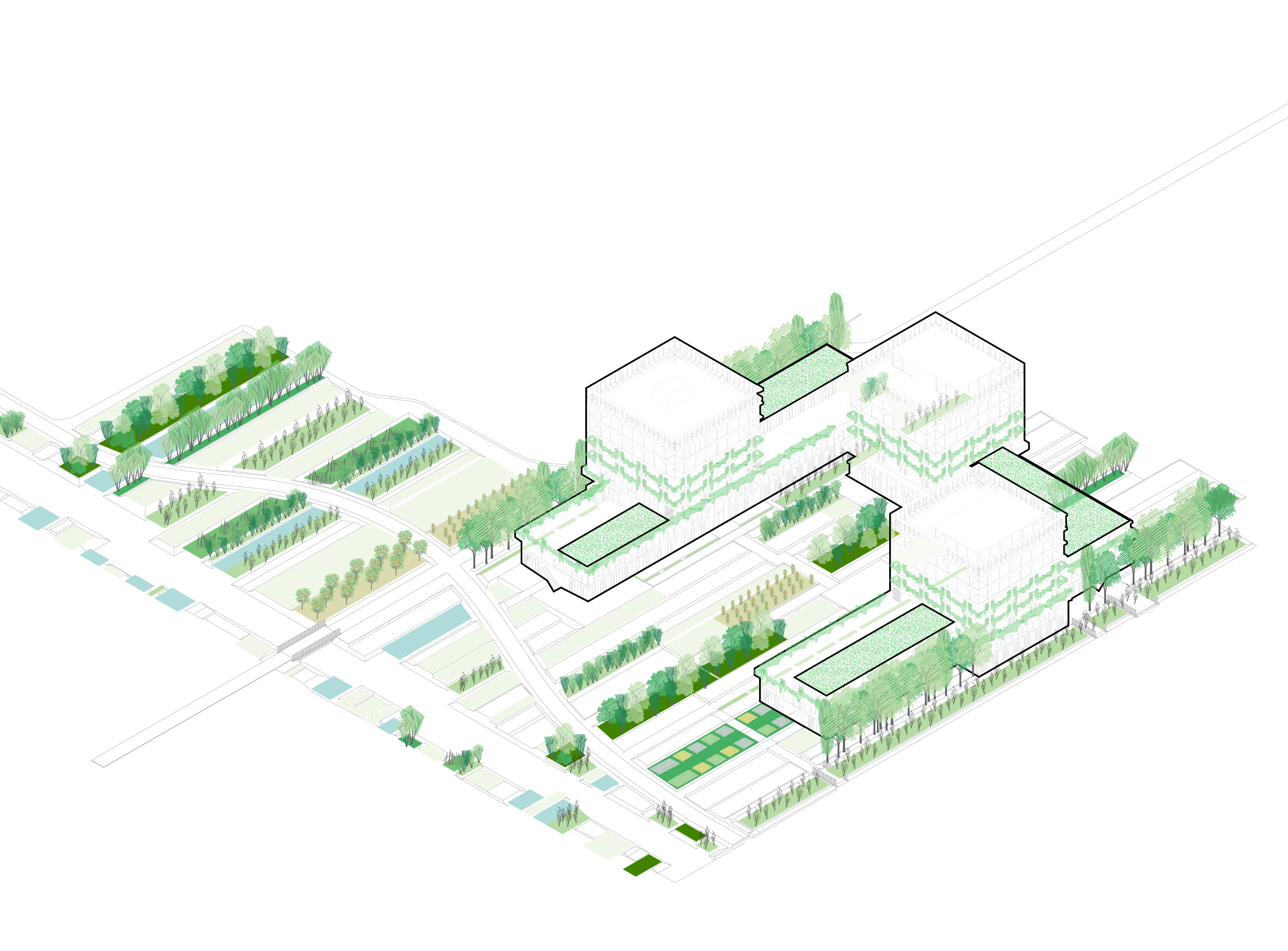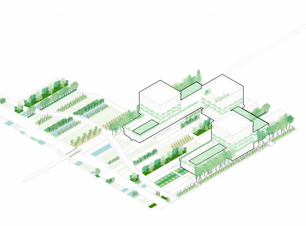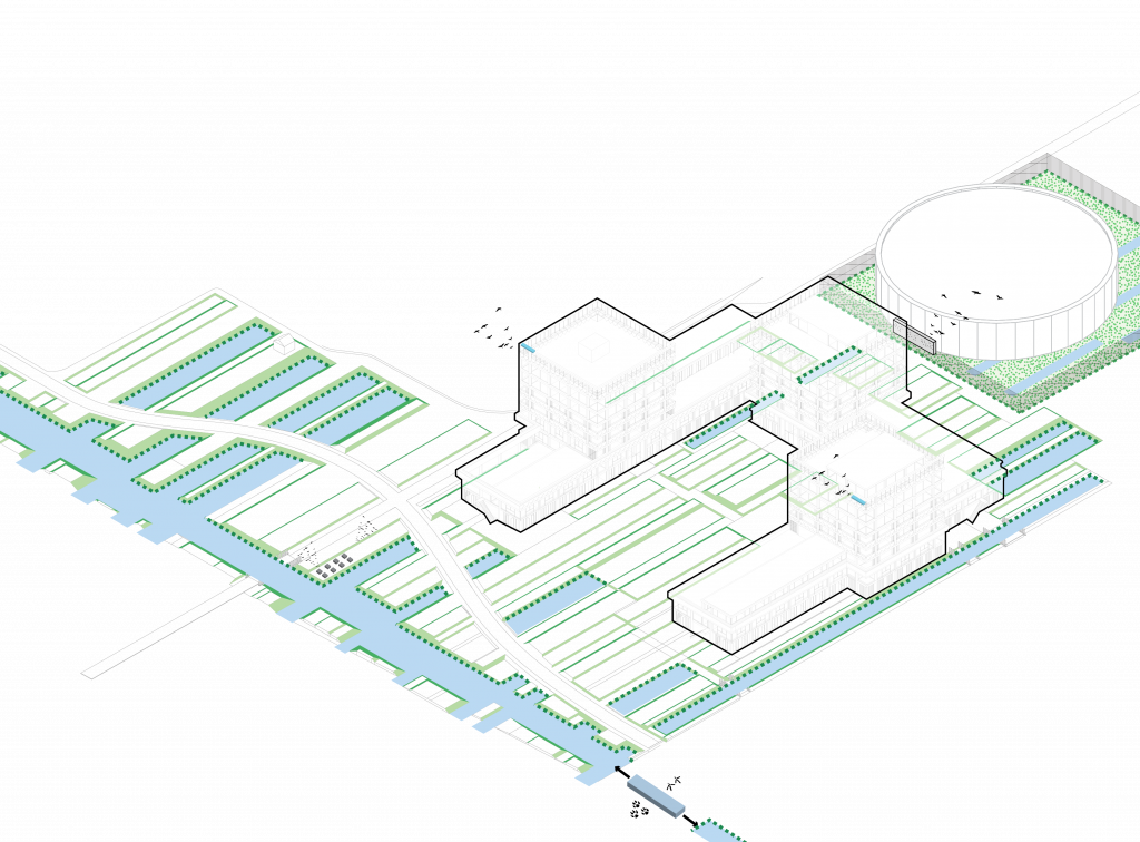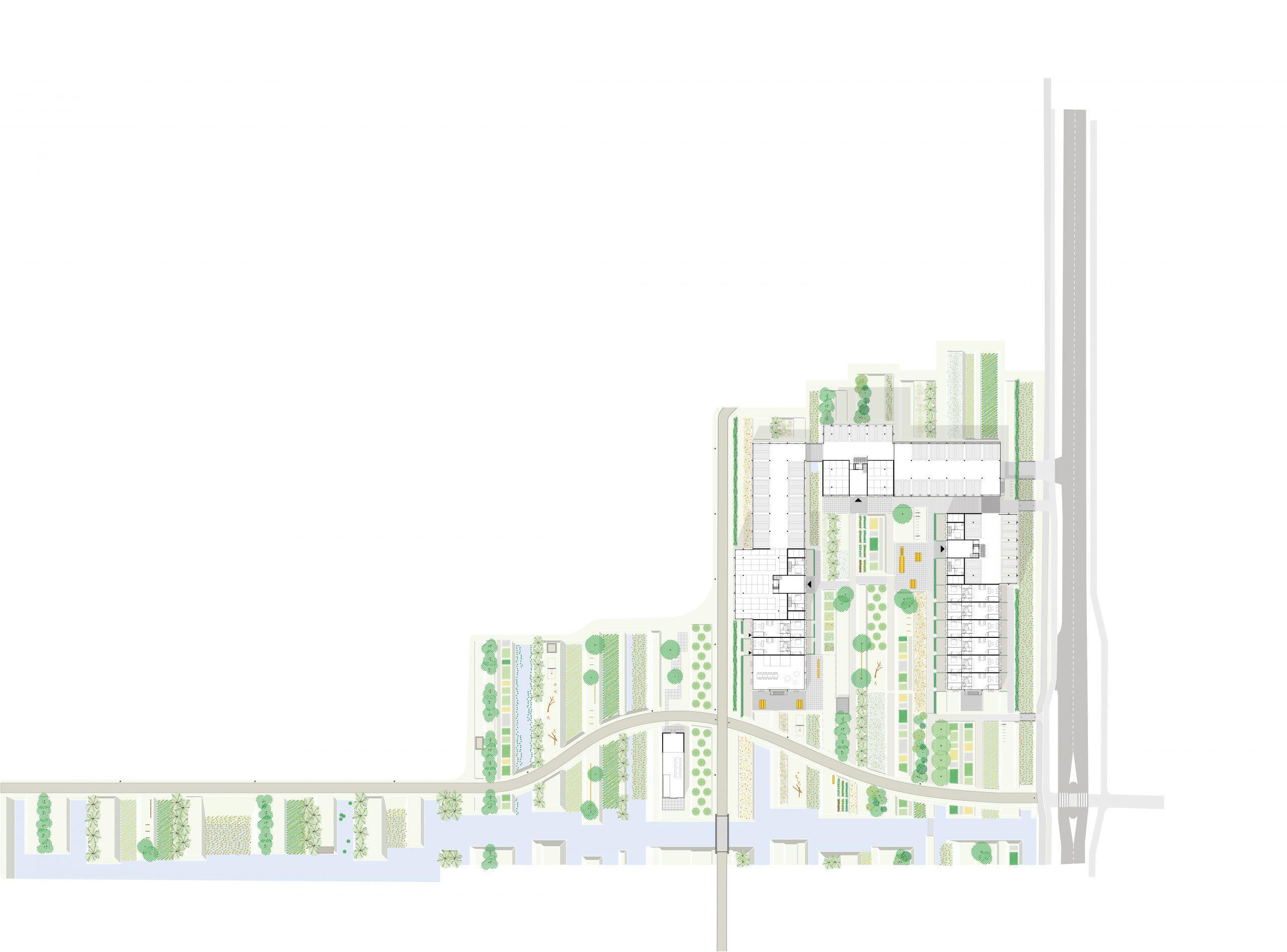 De Stadsbiotoop presenteert een nieuwe vorm van stedelijkheid. Hier gedraagt het landschap zich als stad en de stad als landschap. Zo is het landschap stedelijk intensief geprogrammeerd. Een watermachine zuivert het grijze water en zorgt voor variatie in flora en fauna. Er zijn woongebouwen en multifunctionele verzamelgebouwen. Bewoners kweken er hun eigen voedsel. Overal zijn plekken om te werken, spelen en sporten. Het landschap is opgebouwd uit rabatten die door hoogteverschillen een natuurlijke zonering creëren van openbaar, semi-publiek en privaat gebruik. Hoe dichter bij de gebouwen, hoe hoger de ligging en hoe privater het gebruik. De architectuur voegt zich naadloos in dit rabattenpark. De gebouwen hebben stedelijke volumes, programma’s en trekken een diversiteit van bewoners aan. Tegelijkertijd verbinden hun groene gevels de woningen met de natuur. Elke bewoner heeft een buitenruimte waar de gemiddelde stedeling alleen maar van kan dromen. Kortom, de symbiose van stad en land brengt ogenschijnlijk tegengestelde functies – wonen, ecologie, waterbeheer, recreatie – samen in de Stadsbiotoop
