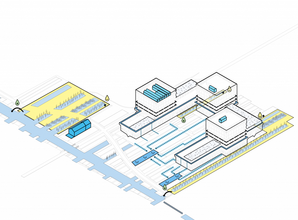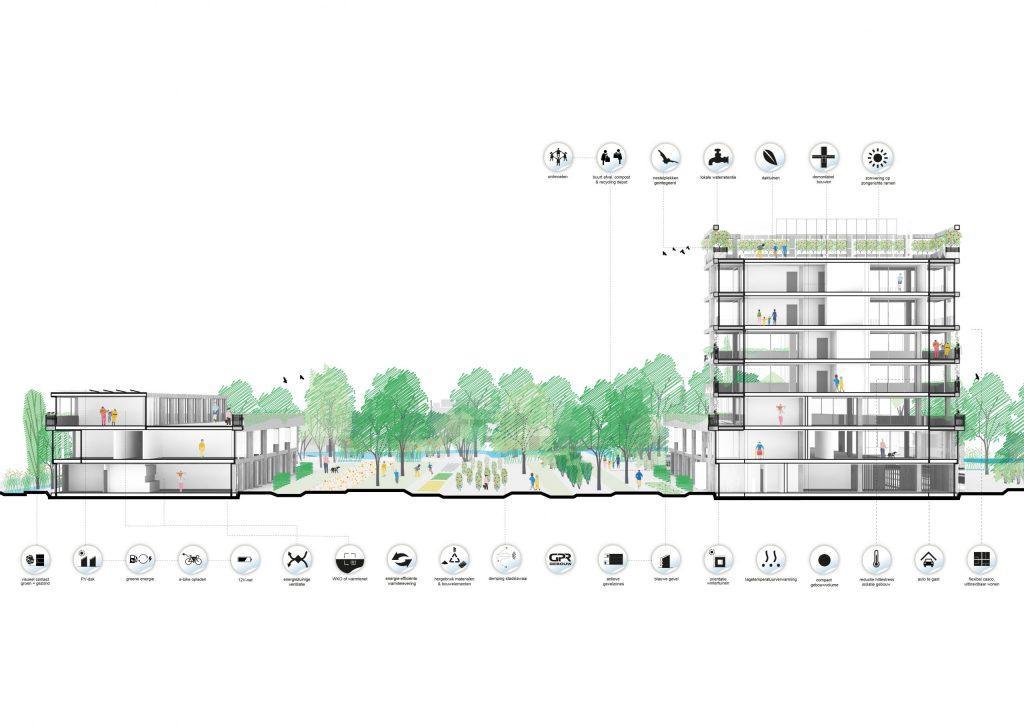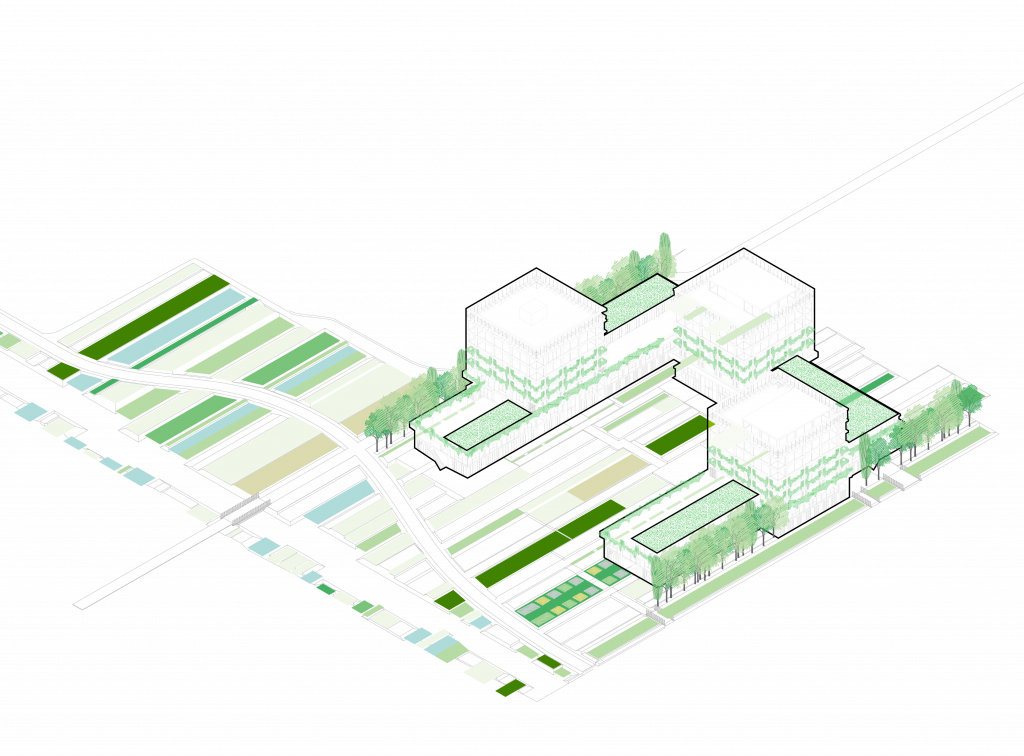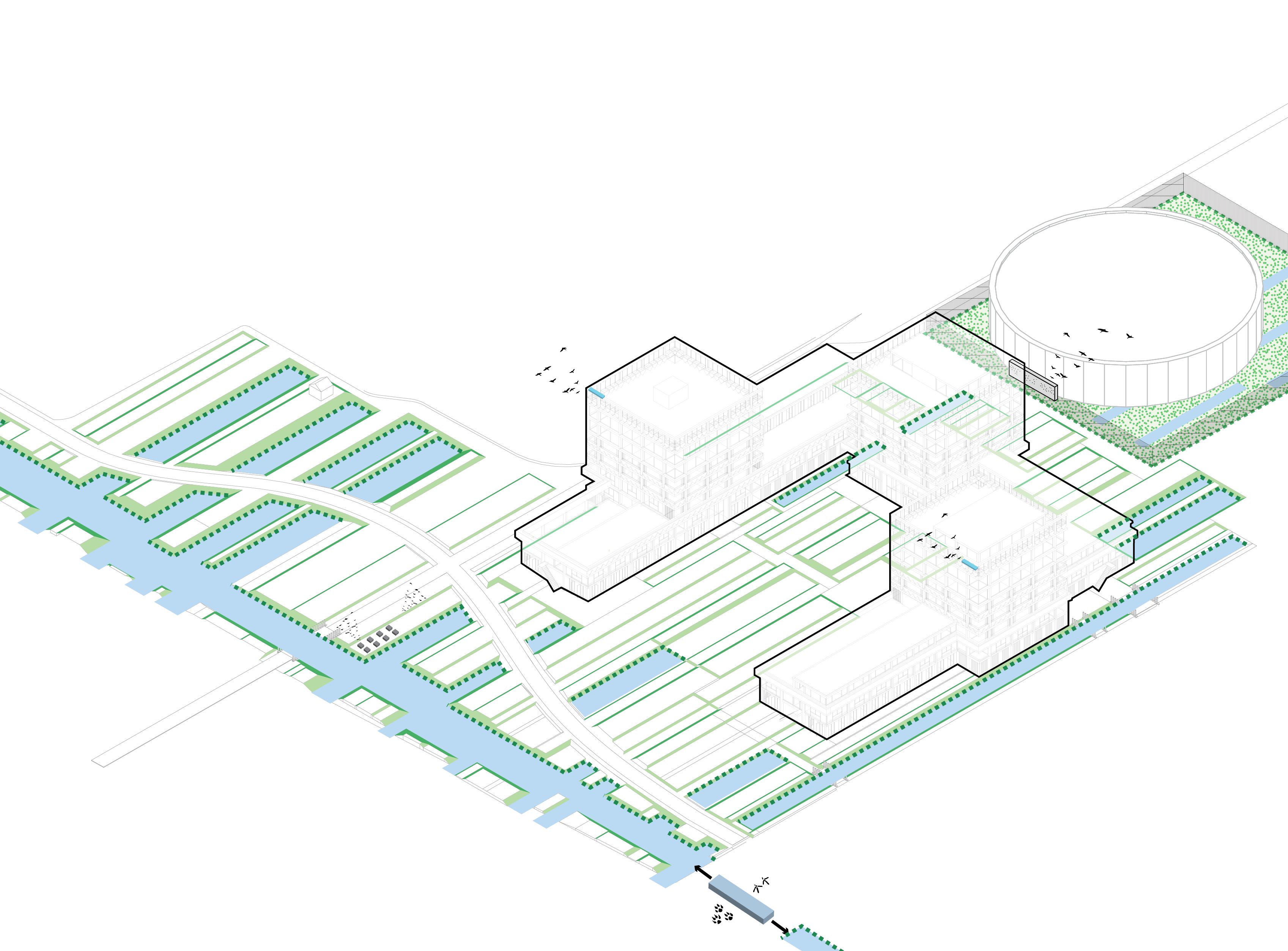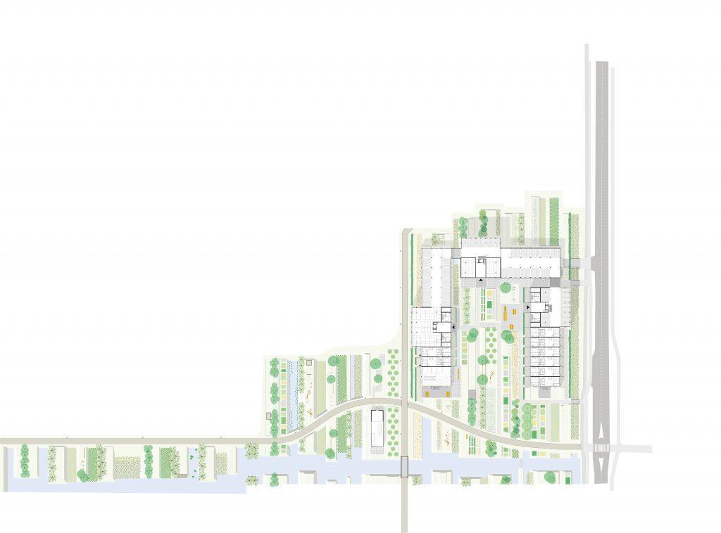 De Stadsbiotoop presenteert een nieuwe vorm van stedelijkheid. Hier gedraagt het landschap zich als stad en de stad als landschap. Zo is het landschap stedelijk intensief geprogrammeerd. Een watermachine zuivert het grijze water en zorgt voor variatie in flora en fauna. Er zijn woongebouwen en multifunctionele verzamelgebouwen. Bewoners kweken er hun eigen voedsel. Overal zijn plekken om te werken, spelen en sporten. Het landschap is opgebouwd uit rabatten die door hoogteverschillen een natuurlijke zonering creëren van openbaar, semi-publiek en privaat gebruik. Hoe dichter bij de gebouwen, hoe hoger de ligging en hoe privater het gebruik. De architectuur voegt zich naadloos in dit rabattenpark. De gebouwen hebben stedelijke volumes, programma’s en trekken een diversiteit van bewoners aan. Tegelijkertijd verbinden hun groene gevels de woningen met de natuur. Elke bewoner heeft een buitenruimte waar de gemiddelde stedeling alleen maar van kan dromen. Kortom, de symbiose van stad en land brengt ogenschijnlijk tegengestelde functies – wonen, ecologie, waterbeheer, recreatie – samen in de Stadsbiotoop