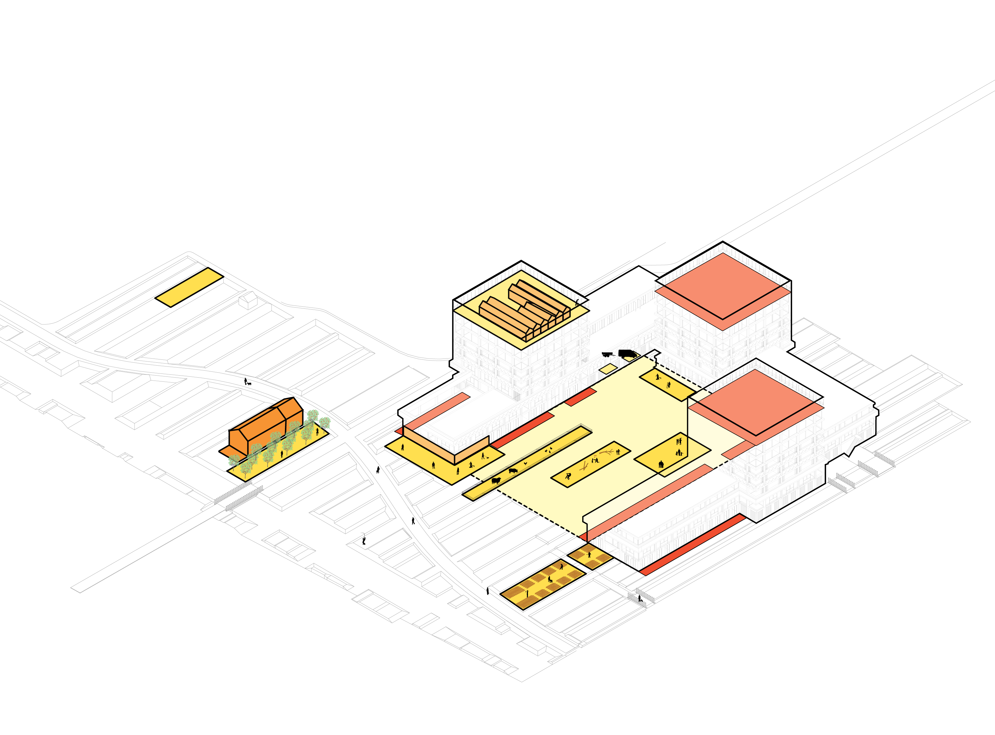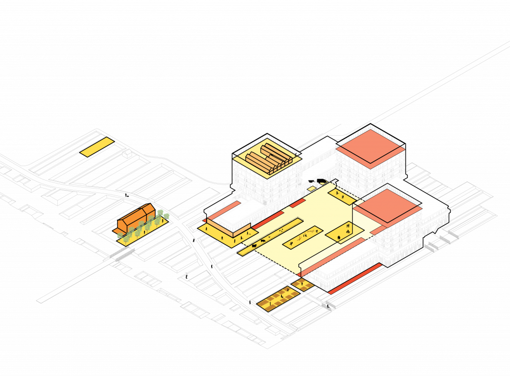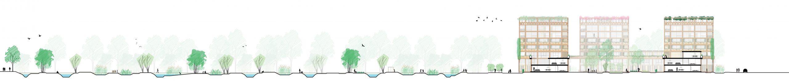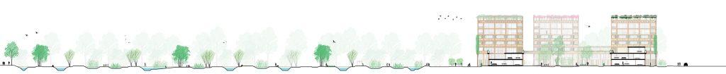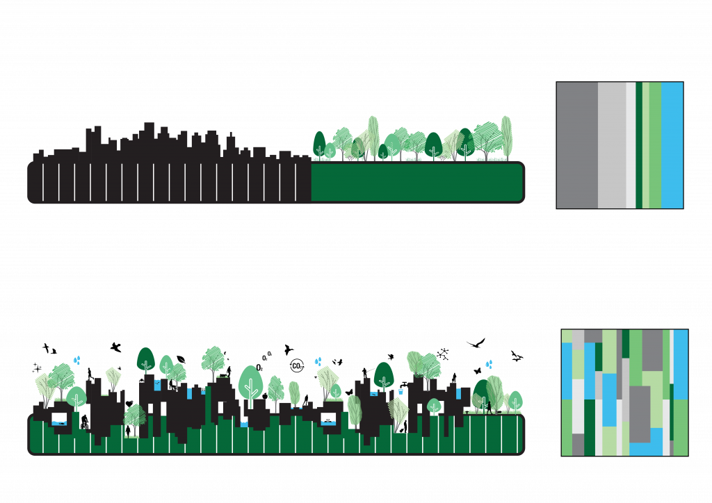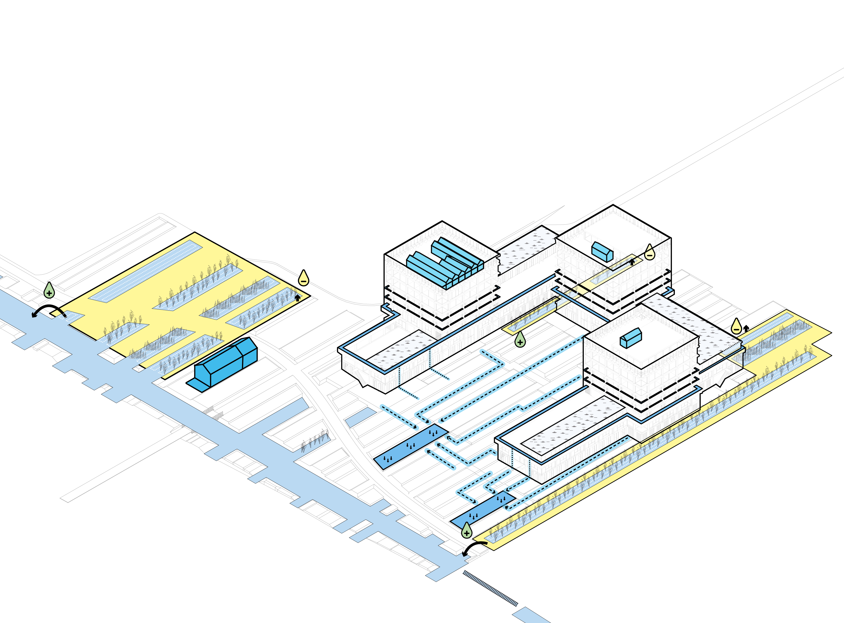 De Stadsbiotoop presenteert een nieuwe vorm van stedelijkheid. Hier gedraagt het landschap zich als stad en de stad als landschap. Zo is het landschap stedelijk intensief geprogrammeerd. Een watermachine zuivert het grijze water en zorgt voor variatie in flora en fauna. Er zijn woongebouwen en multifunctionele verzamelgebouwen. Bewoners kweken er hun eigen voedsel. Overal zijn plekken om te werken, spelen en sporten. Het landschap is opgebouwd uit rabatten die door hoogteverschillen een natuurlijke zonering creëren van openbaar, semi-publiek en privaat gebruik. Hoe dichter bij de gebouwen, hoe hoger de ligging en hoe privater het gebruik. De architectuur voegt zich naadloos in dit rabattenpark. De gebouwen hebben stedelijke volumes, programma’s en trekken een diversiteit van bewoners aan. Tegelijkertijd verbinden hun groene gevels de woningen met de natuur. Elke bewoner heeft een buitenruimte waar de gemiddelde stedeling alleen maar van kan dromen. Kortom, de symbiose van stad en land brengt ogenschijnlijk tegengestelde functies – wonen, ecologie, waterbeheer, recreatie – samen in de Stadsbiotoop