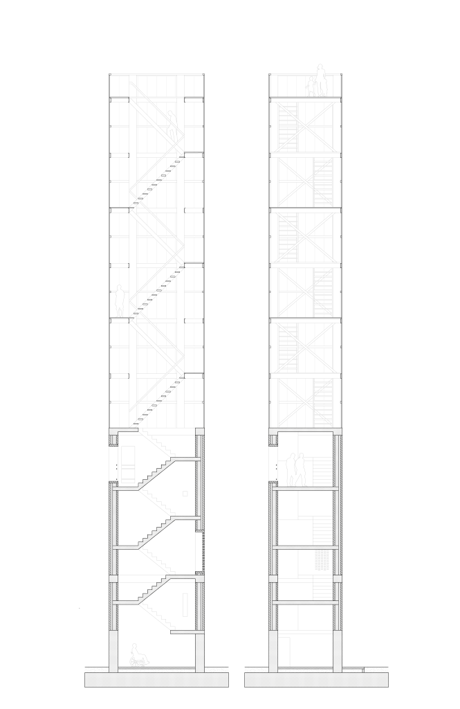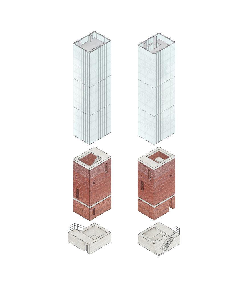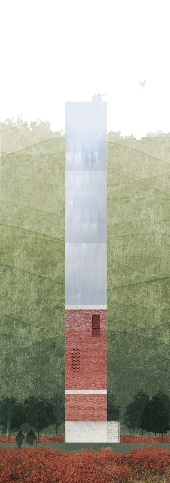 De observatietoren van Doomkerke is gesitueerd in het Disveld, aan de rand van het dorp en op een recreatief knooppunt. In zijn verschijningsvorm en materialisatie weerspiegelt de toren de gelaagdheid van de plek. Het onderste gedeelte, opgebouwd uit beton, toont de gagel en bossen van het Disveld. Het gevarieerde metselwerk in rode baksteen van de middenbouw zien we terug in de bebouwing in het dorp. De weg naar boven verloopt via transparante volumes waar het gefilterde daglicht slechts de contouren van de omgeving prijs geeft. Voor het eerst op de 31 meter hoge top zien we het volledige landschappelijke panorama. De route naar de toren en de top speelt op verschillende manieren met de zintuiglijke waarneming van de bezoeker waardoor hij zich bewust wordt van zijn aanwezigheid op deze specifieke plek. Tegelijkertijd worden via informatievoorzieningen bijzondere verhalen gedeeld over de landschappelijke en sociale geschiedenis van Doomkerke. Het is precies de combinatie van de architectonische expressie, de zintuiglijke ervaring en het gedeelde narratief dat de observatietoren tot een attractie op zich maakt.