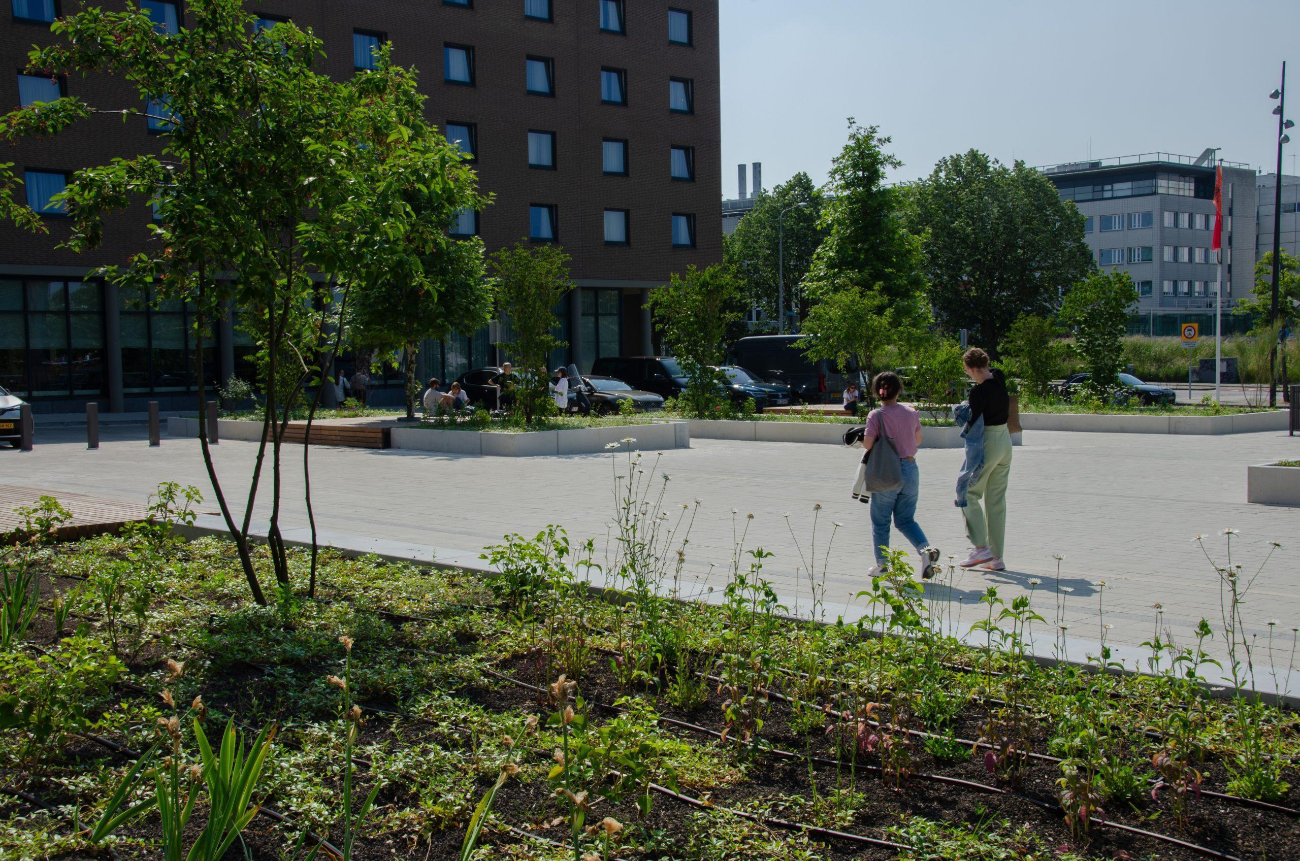 Forumplein Maastricht Een levendig plein waar mensen elkaar treffen in het groen