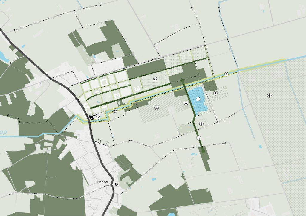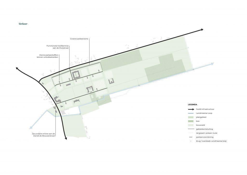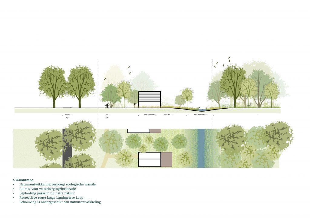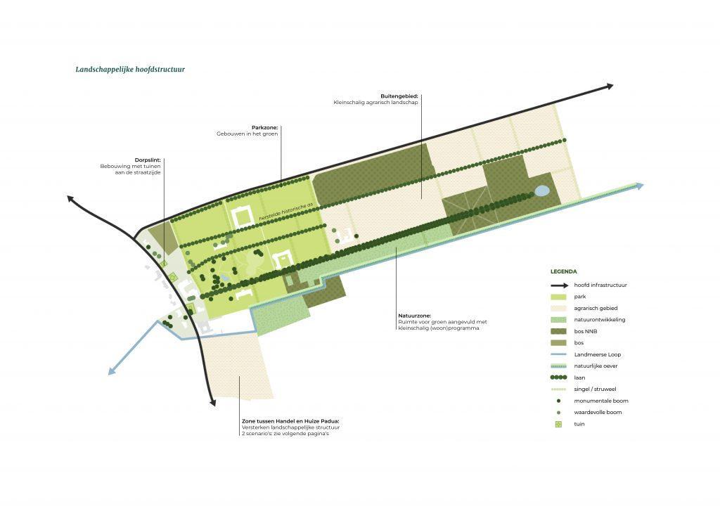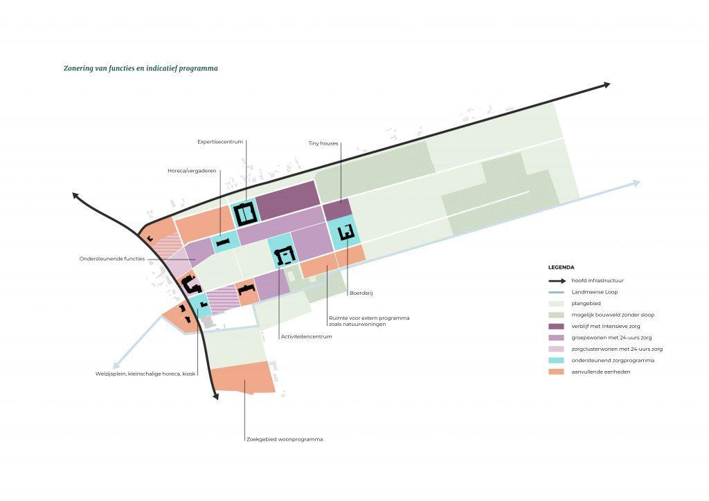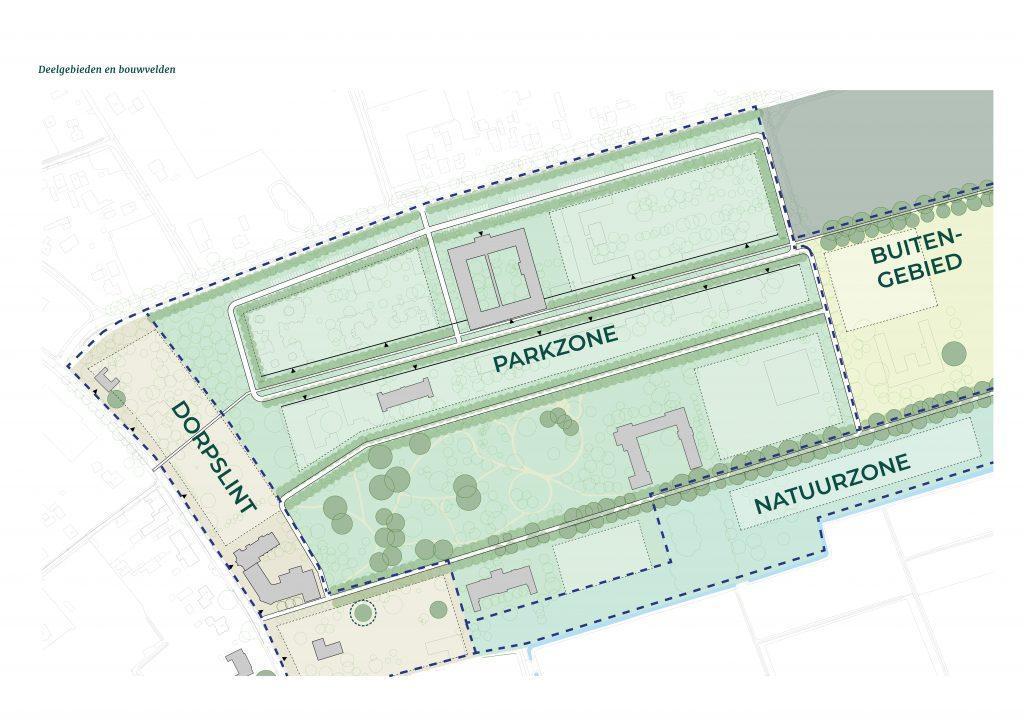 Het landgoed wordt onderverdeeld in vier deelgebieden: In de Parkzone wordt de sfeer van het bestaande park met dierenweide doorgetrokken tussen de gebouwen. De groene tussenruimtes die ontstaan zorgen voor nieuwe, informele wandelroutes en verblijfsplekken. De zone langs de Daniël de Brouwerstraat wordt ingericht als Dorpslint met onder andere een ‘dorpsplein’ en een recreatieve entree tot het landgoed. Aan de rand van het plangebied, in de Natuurzone langs de historische Landmeerse Loop, is ruimte voor natuurontwikkeling in combinatie met kleinschalige (bos)woningen. In het Buitengebied, aan de achterzijde van het landgoed, wordt ingezet op kleinschalige landbouwinitiatieven, natuurontwikkeling en woonprogramma in de vorm van tiny houses.