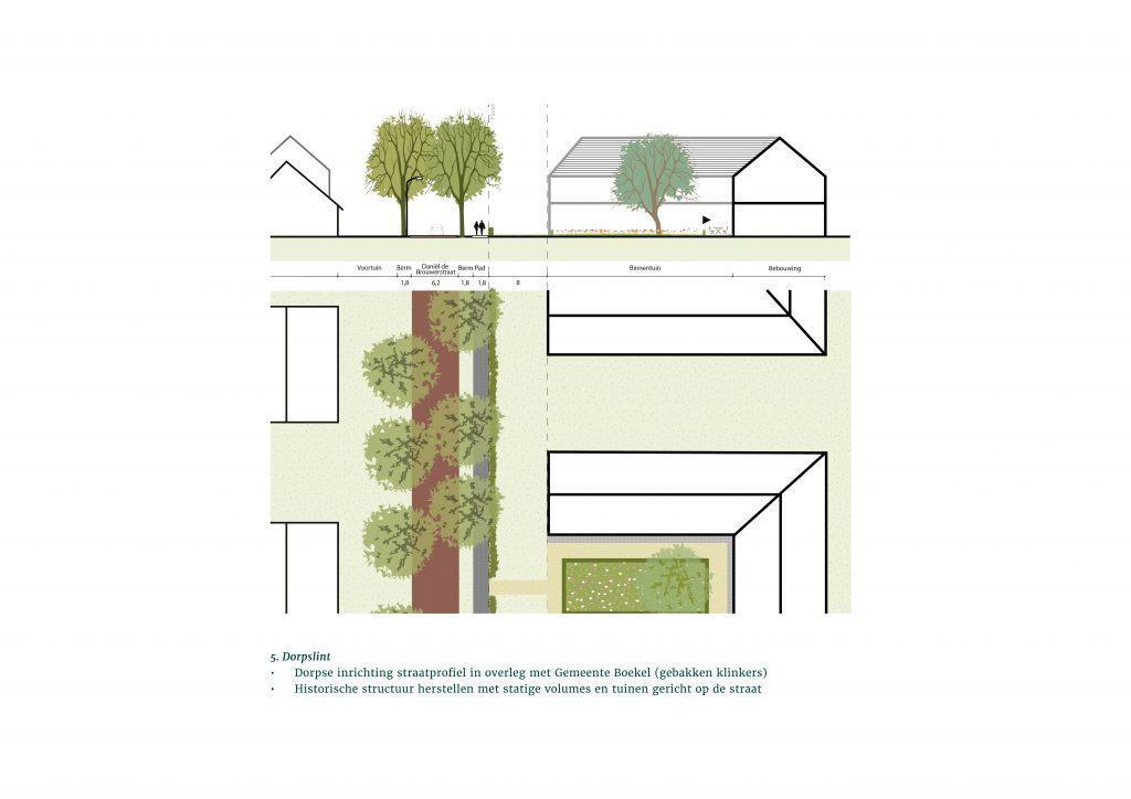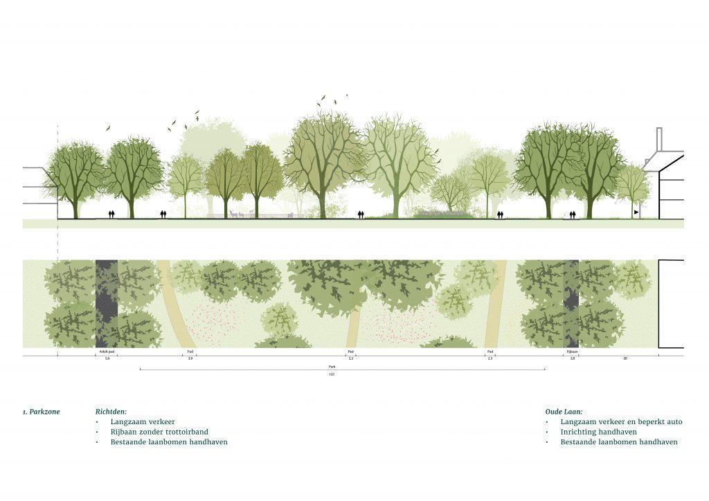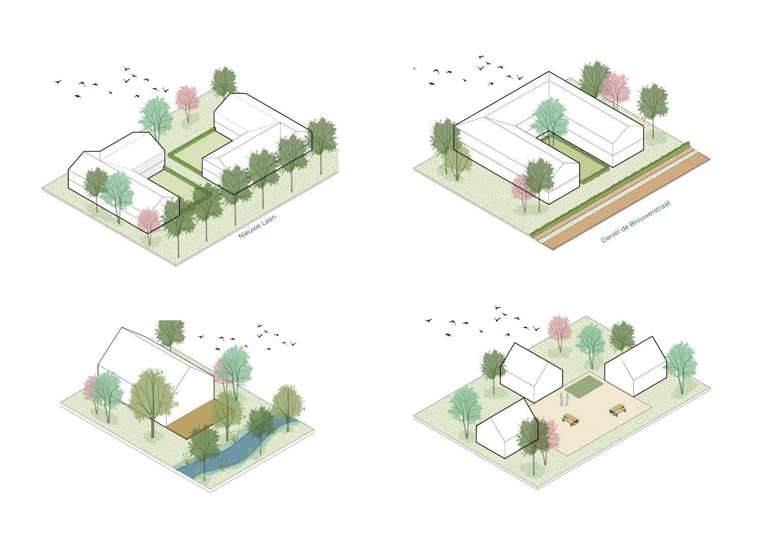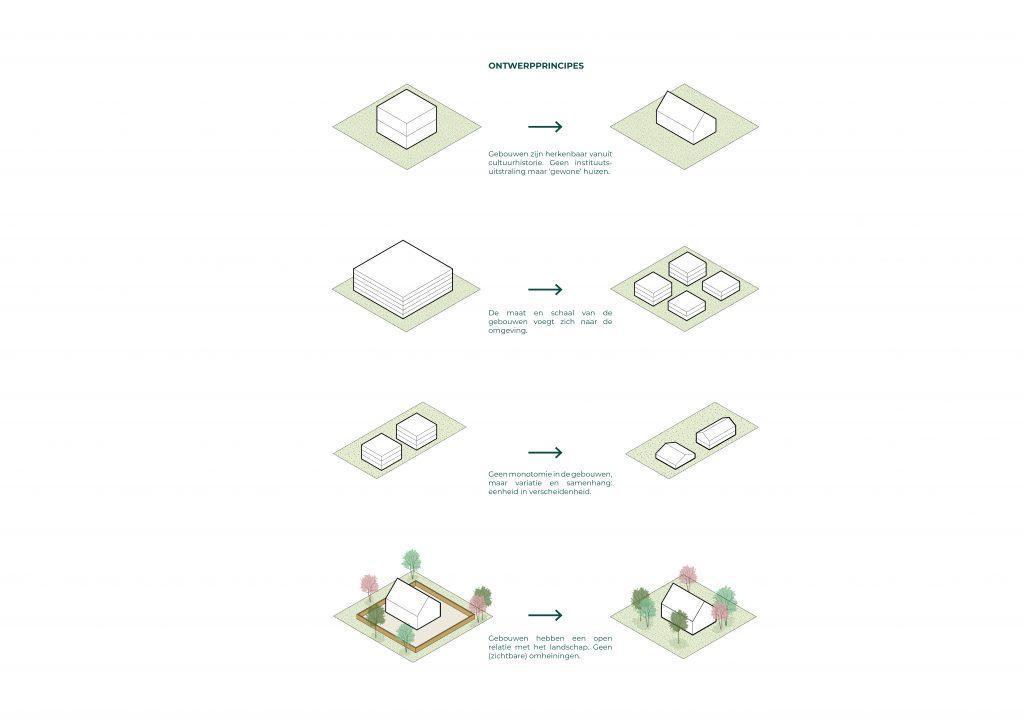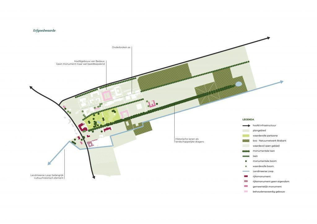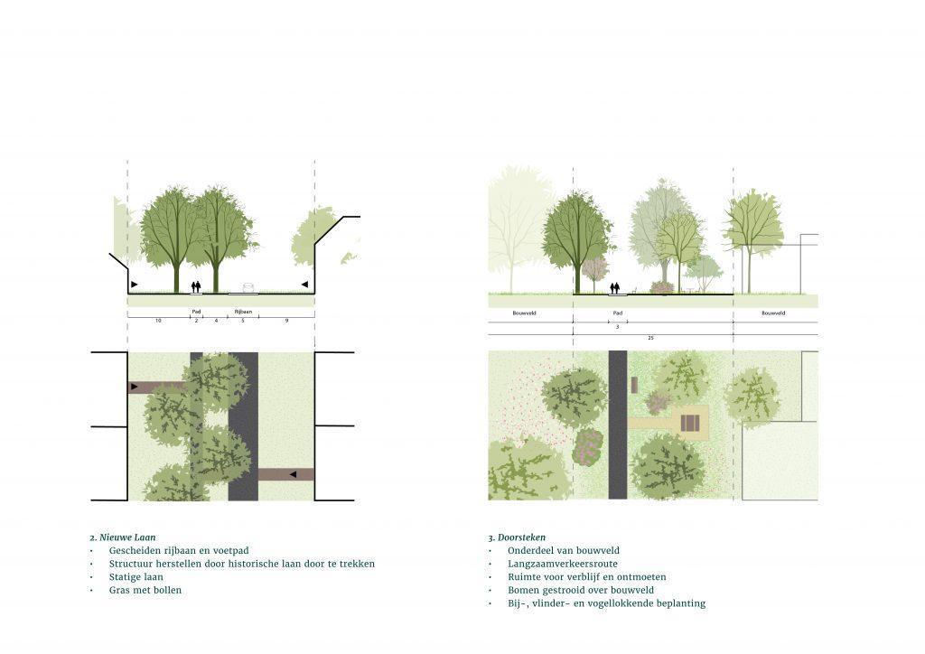Het landgoed wordt onderverdeeld in vier deelgebieden: In de Parkzone wordt de sfeer van het bestaande park met dierenweide doorgetrokken tussen de gebouwen. De groene tussenruimtes die ontstaan zorgen voor nieuwe, informele wandelroutes en verblijfsplekken. De zone langs de Daniël de Brouwerstraat wordt ingericht als Dorpslint met onder andere een ‘dorpsplein’ en een recreatieve entree tot het landgoed. Aan de rand van het plangebied, in de Natuurzone langs de historische Landmeerse Loop, is ruimte voor natuurontwikkeling in combinatie met kleinschalige (bos)woningen. In het Buitengebied, aan de achterzijde van het landgoed, wordt ingezet op kleinschalige landbouwinitiatieven, natuurontwikkeling en woonprogramma in de vorm van tiny houses.
