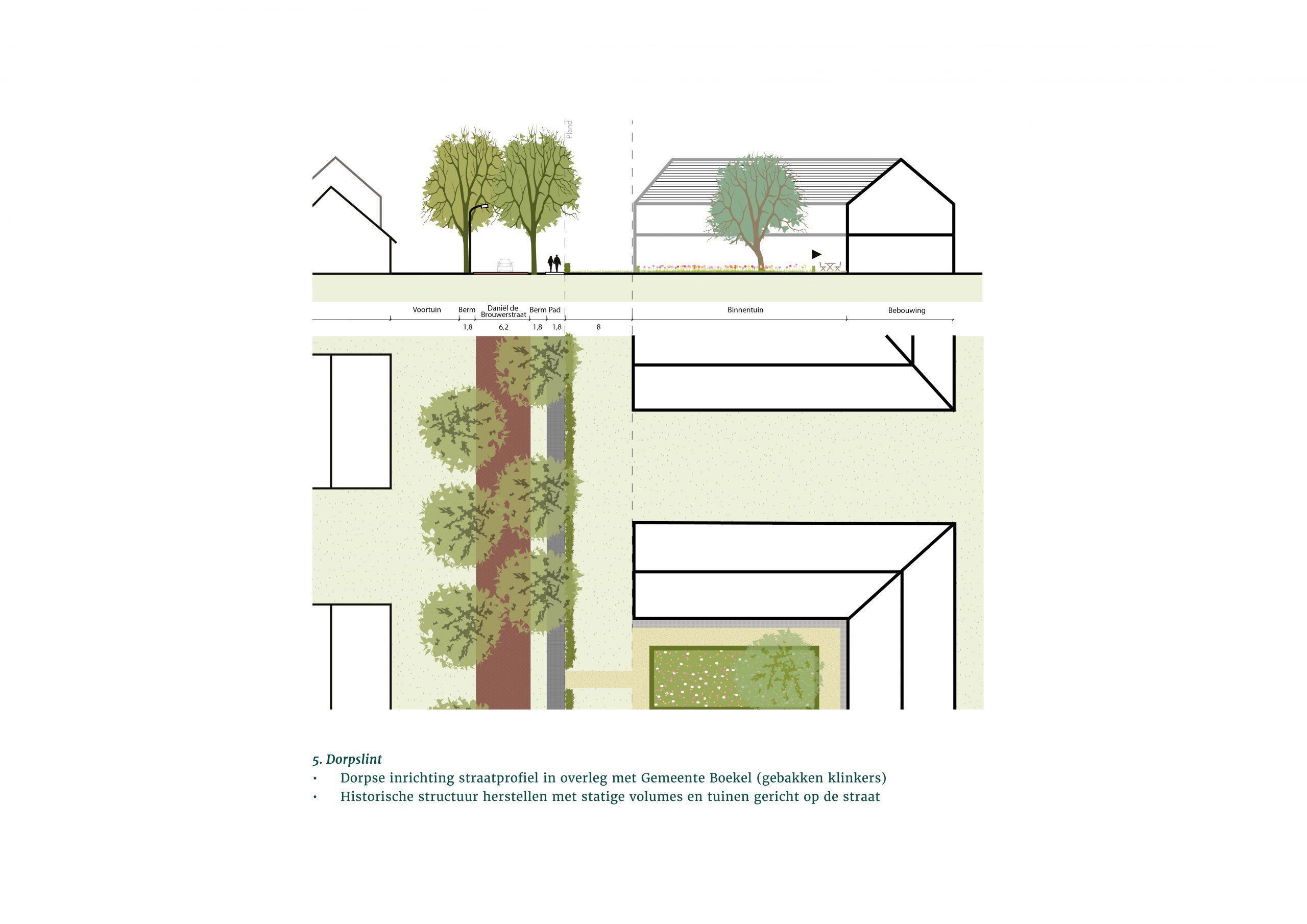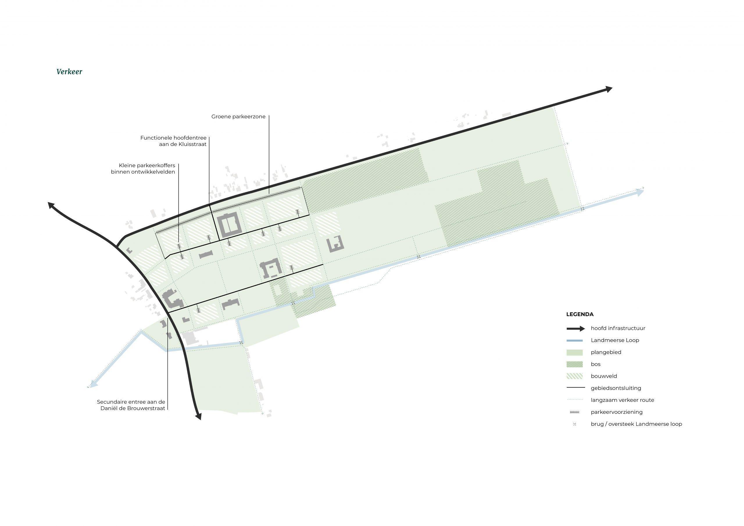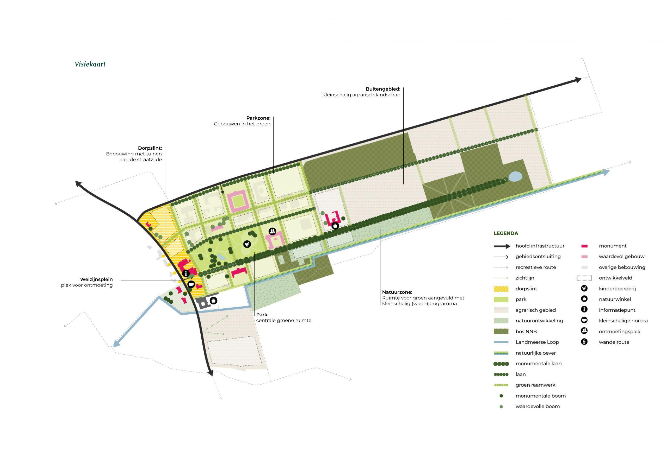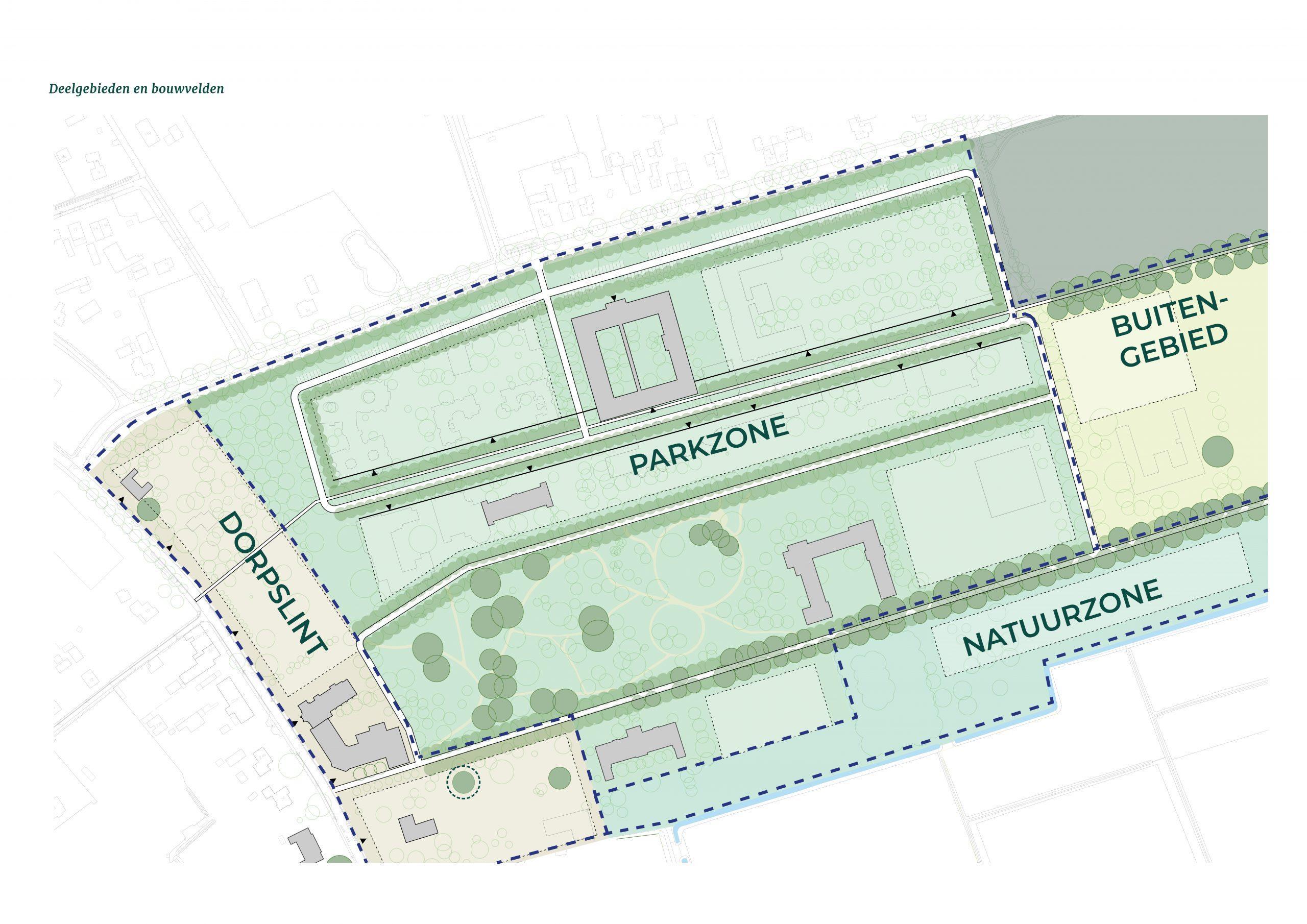 Het landgoed wordt onderverdeeld in vier deelgebieden: In de Parkzone wordt de sfeer van het bestaande park met dierenweide doorgetrokken tussen de gebouwen. De groene tussenruimtes die ontstaan zorgen voor nieuwe, informele wandelroutes en verblijfsplekken. De zone langs de Daniël de Brouwerstraat wordt ingericht als Dorpslint met onder andere een ‘dorpsplein’ en een recreatieve entree tot het landgoed. Aan de rand van het plangebied, in de Natuurzone langs de historische Landmeerse Loop, is ruimte voor natuurontwikkeling in combinatie met kleinschalige (bos)woningen. In het Buitengebied, aan de achterzijde van het landgoed, wordt ingezet op kleinschalige landbouwinitiatieven, natuurontwikkeling en woonprogramma in de vorm van tiny houses.