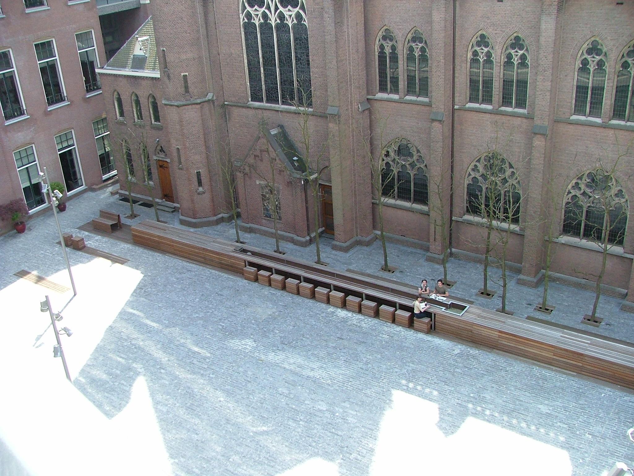 Toen de voormalige school- en kloostergebouwen getransformeerd werden tot appartementencomplex ontstond de kans om voor de bewoners een aangename binnentuin te ontwerpen waar men elkaar kan treffen, samen dineren of gewoon rustig kan zitten mijmeren. Het decor wordt gevormd door de neogotische gevel van de oude kloosterkapel in combinatie met hedendaagse strakke architectuur. Buro Lubbers heeft de inrichting van de buitenruimte daarom bewust sober gehouden. Ierse hardsteen, houten meubilair en een uitgekiend verlichtingsplan geven de plek sereniteit en allure.