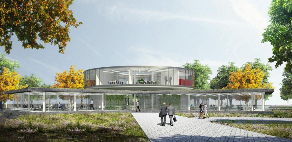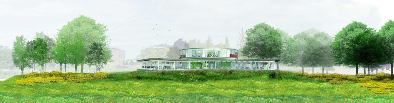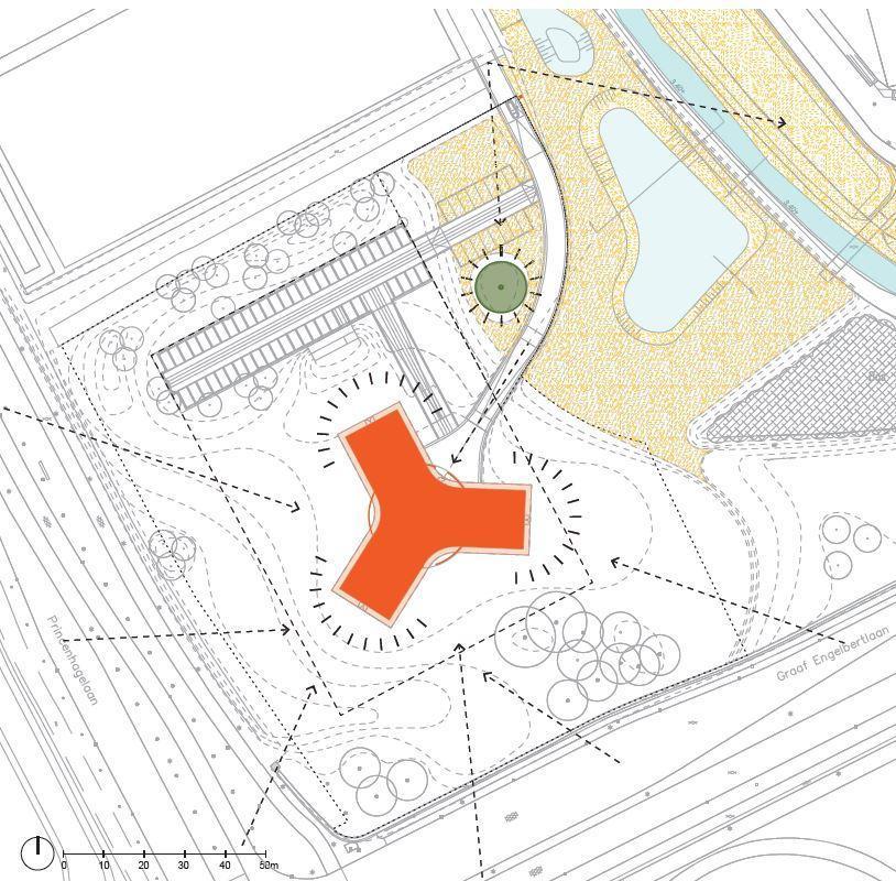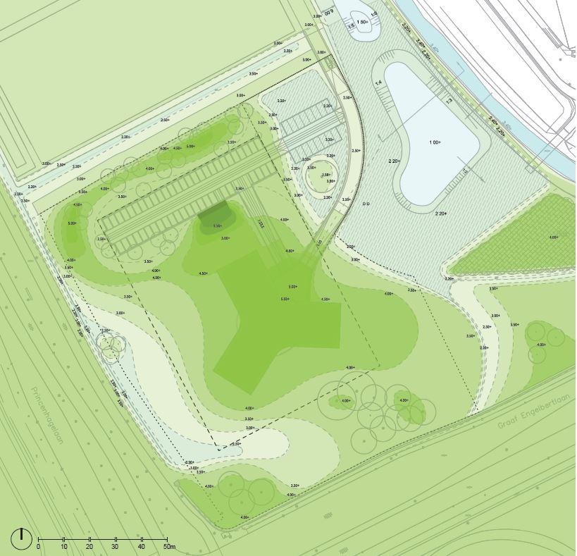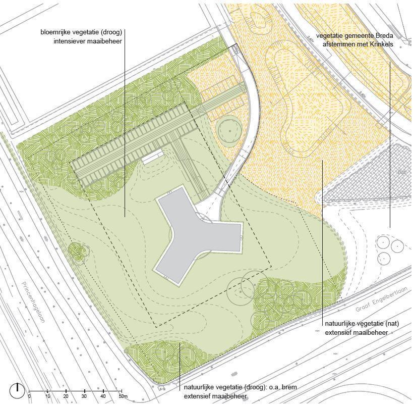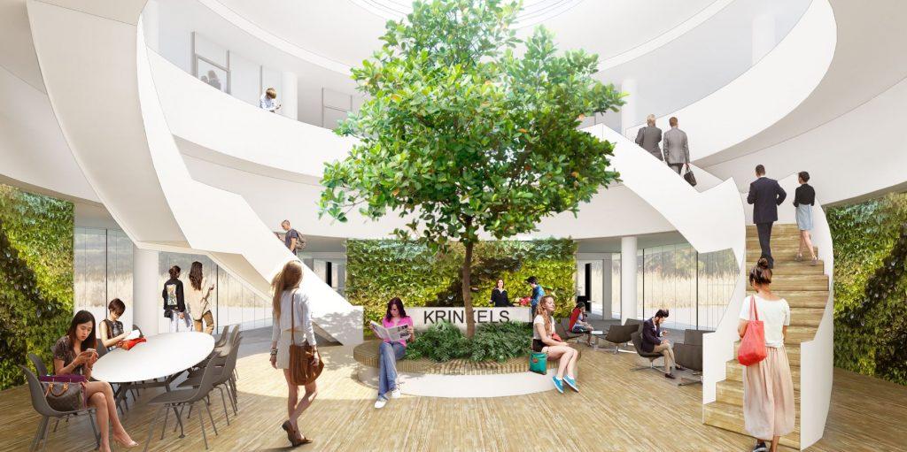 Krinkels is een toonaangevende aannemer voor beheer, onderhoud en inrichting van de openbare ruimte in Nederland met een sterke focus op duurzaamheid. Het nieuwe hoofdkantoor in Breda weerspiegelt de missie van Krinkels: een mooie, veilige, schone en groene leefomgeving. Het glazen gebouw, ontworpen door Paul de Ruiter Architects, vormt één geheel met het landschap, een groene parkachtige ruimte ontworpen door Buro Lubbers. Het terrein bevindt zich enerzijds op een strategische ligging aan invalsroutes naar Breda en anderzijds grenst het aan een ecologische beekzone. Deze dynamiek tussen cultuur en natuur ligt daarom aan de basis van de inrichting. Een glooiend landschap van kruidenrijk gras creëert een logisch verloop van meer cultuurlijke (siertuinen, parkeren) naar meer natuurlijke (laagtes, vegetatie) delen. Iets opgehoogd staat het gebouw op een voetstuk in het centrum van dit glooiende landschap. Gebouw en landschap vormen samen het visitekaartje van Krinkels: transparant, duurzaam en groen.